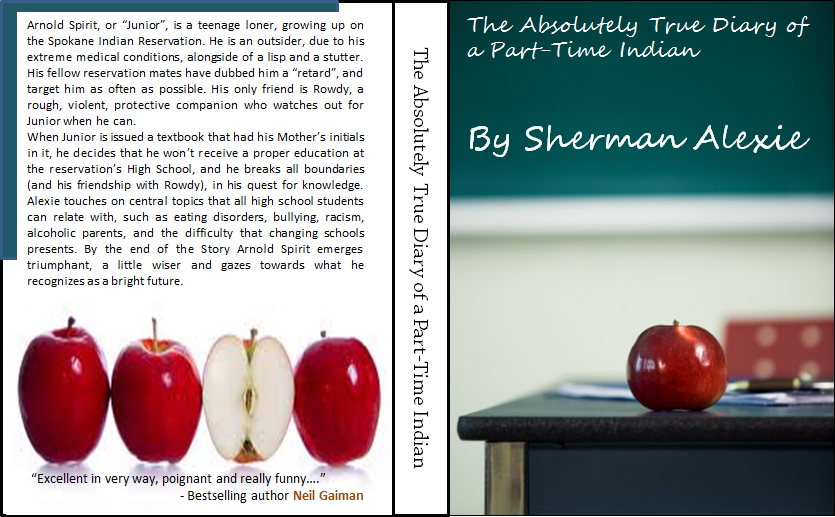 For our book cover, we thought that the apple was a great image for the book, because it signified the conflicted way that Junior saw himself. Torn between two different societal pressures, Junior tries to be true to what he thinks is best for his future, regardless of the bullying and ostracization that he experiences for his choice. For the front, we thought that the school setting was important because education plays a key role in the decision of Junior, while the blackboard in the back was perfect for the title, making it look like it was written in chalk.